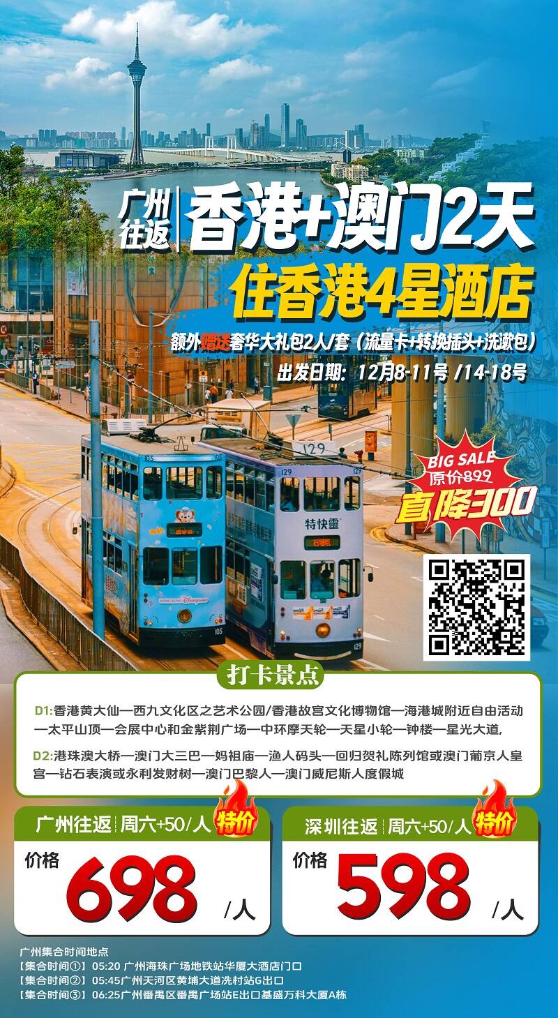 D1:香港黄大仙一西九文化区之艺术公园/香港故宫文化博物馆一海港城附近自由活动一太平山顶一会展中心和金紫荆广场一中环摩天轮一天星小轮一钟楼一星光大道,D2:港珠澳大桥一澳门大三巴一妈祖庙一渔人码头一回归贺礼陈列馆或澳门葡京人皇宫一钻石表演或永利发财树一澳门巴黎人一澳门威尼斯人度假城