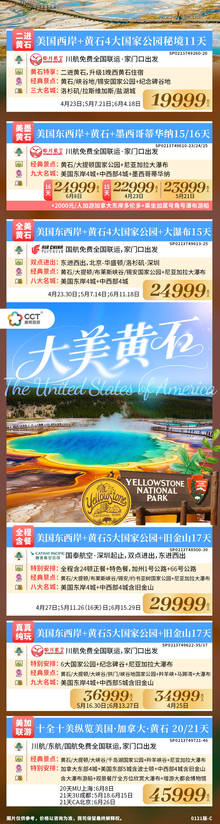 黄石SP0213749613-25AIRCHINA国航免费全国联运,家门口出发中国旧際舰宁公司双点进出:东进西出,北京-华盛顿/洛杉矶-深圳经典景点:黄石/大提顿/布莱斯峡谷/锡安国家公园+尼亚加拉大瀑布八大名城:美国车岸4城+中西部4城24999元天4月23.30日;5月7.14日;6月11.18日