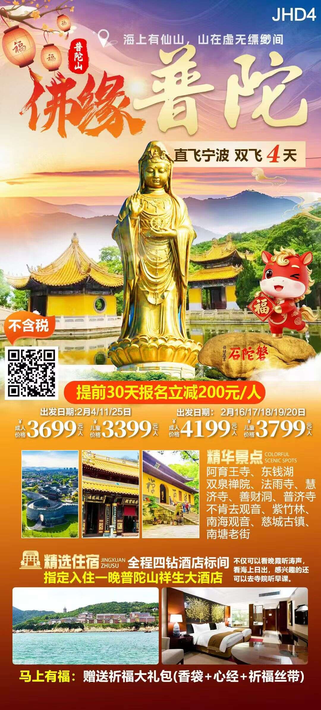 【佛缘普陀】双飞4日游2月25日铁发,余位6个